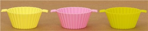 - mini moldes de silicona en amarillo, rosa y verde claro con pequeñas asas del osito Rilakkuma