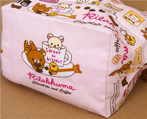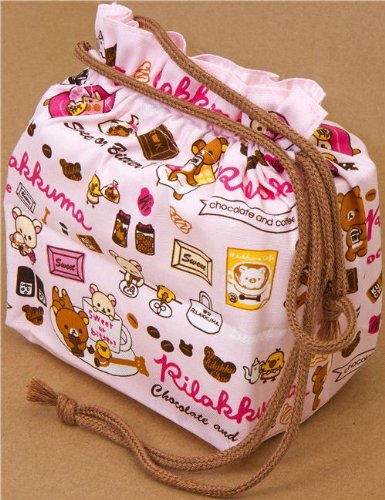- bonita bolsa rosa con rayas para las fiambreras bento con los osos Rilakkuma, Korrilakkuma, el pollito Kiiroitori, un montón de chocolate y café