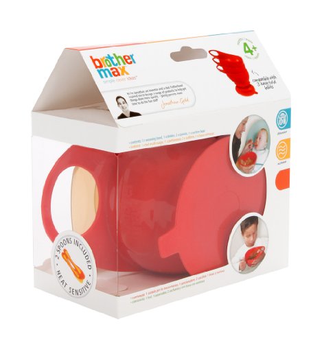 When being fed, baby likes to grab the bowl when you're holding it, so the Brother Max Home And Travel Weaning Bowl has an easy to hold handle that allows your hand to pass through and wrap around the bowl for stability and support. And baby also likes to grab the bowl from the table, this one can be fixed to the table or high chair, yet be easily removed by you. As dirty cutlery soils travel bags, the spoons store inside the bowl's lid and because it's easy to over-heat food, the spoons will change colour if the food is too hot. And what's more, the lid is vented to allow microwaving with the lid on insuring the food doesn't splatter everywhere. Spoons often end up on the floor, so 2 have been included.