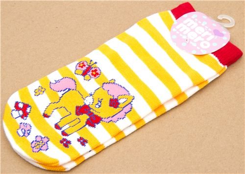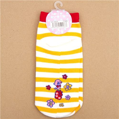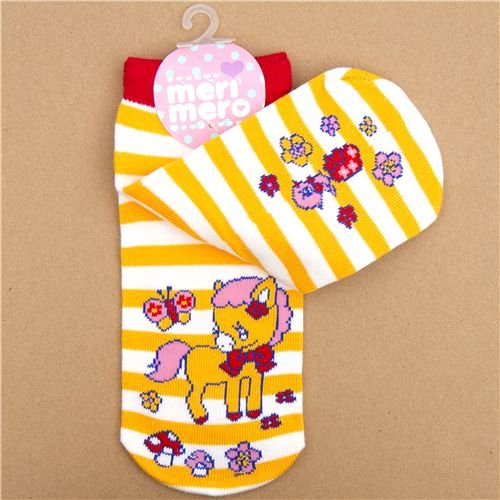 - calcetines por los tobillos con un pony naranja, mariposas, champiñones y flores