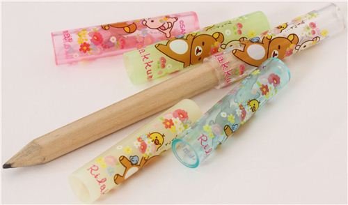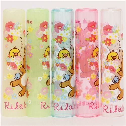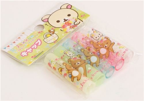 - lindos capuchones de colores para instrumentos de escritura, con Rilakkuma y sus amigos haciendo un picnic en un prado florido, de la colección "Rilakkuma Happy Holiday Picnic"