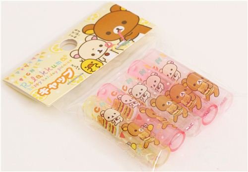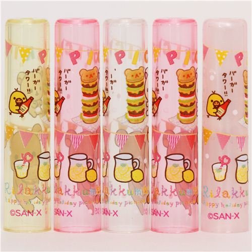 - lindos capuchones de colores para instrumentos de escritura, con Rilakkuma y sus amigos de picnic, hamburguesas y limonada , de la colección "Rilakkuma Happy Holiday Picnic"