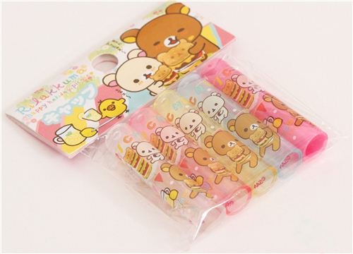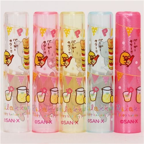 - lindos capuchones de colores para instrumentos de escritura, con Rilakkuma y sus amigos merendando hamburguesas y limonada, de la colección "Rilakkuma Happy Holiday Picnic"