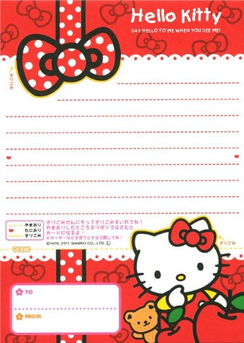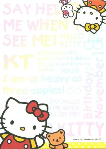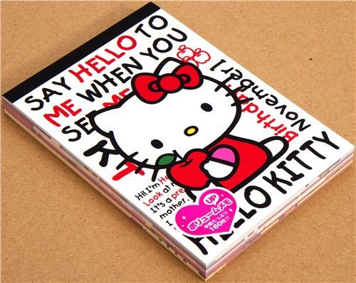 - bonito cuaderno con la gran gata Hello Kitty con una manzana en frente de mucho texto