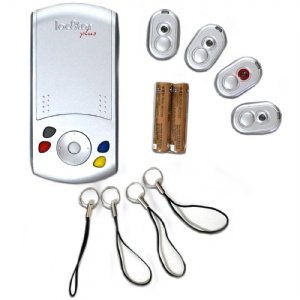 - Sistema de alarma y localización de 4 objetos o personas a la vez identificadas con un mini emisor inteligente que envia la señal al receptor que porta el cuidador