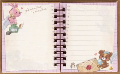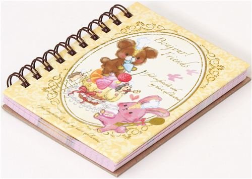 - pequeño cuaderno beis con un conejito, oso y erizo adorables, haciendo un pastel y escribiendo cartas, con tapa dura, adornos dorados y lindos dibujos en cada página