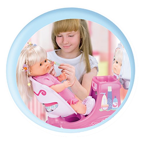 - Descripción del producto: Salón de peluquería con lavacabezas con agua de verdad, secador, rizador, tijeras, uñas postizas, tatuajes, mechas y tintes. Incluye un diploma, tarjetas de visita, lista de precios y un libro para elegir peinados. Muñeca incluida.