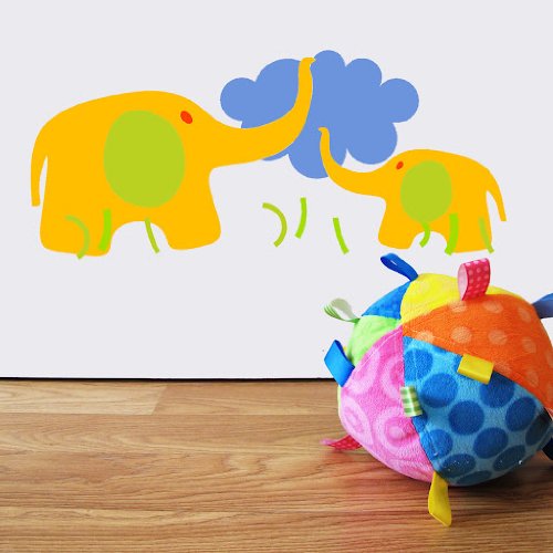 Vinilo decorativo infantil con mamá y bebé elefante en tonos anaranjados con una nube azul de fondo. Contiene 1 lámina de 20x45 cm.